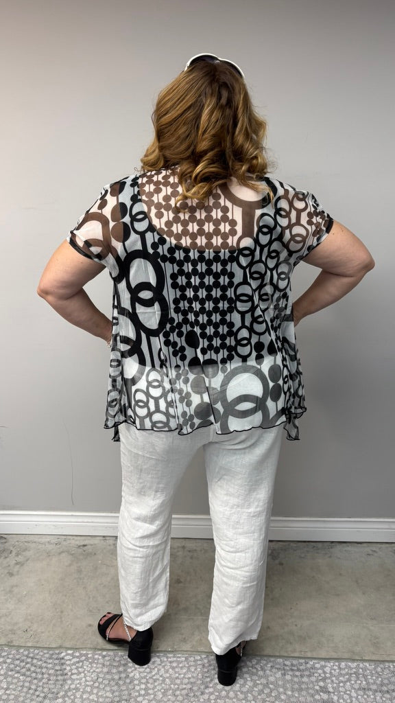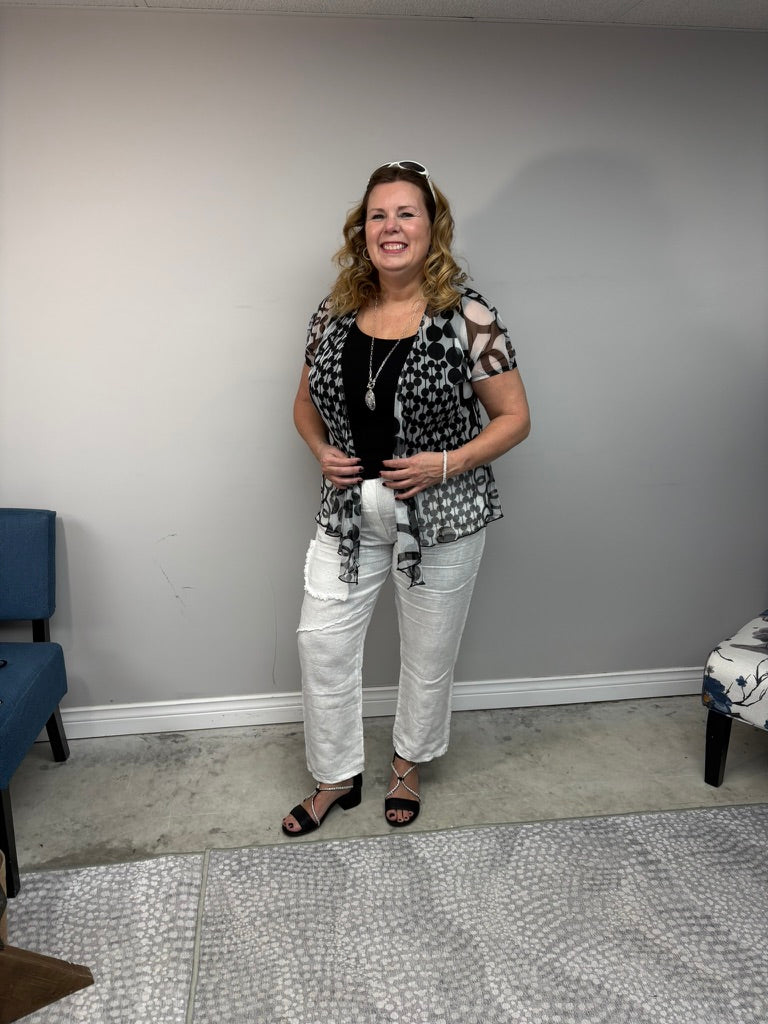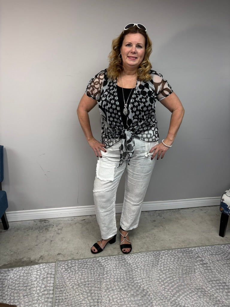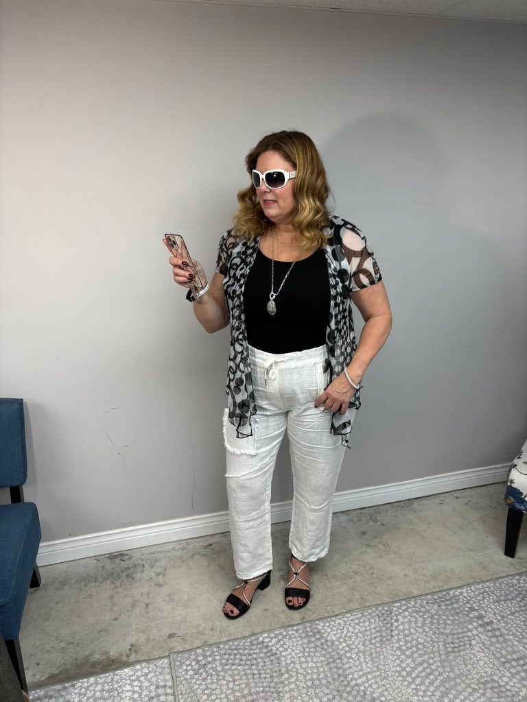 These classic white linen pants are a wardrobe staple, perfect for creating relaxed, polished looks with ease. Designed for versatility, they can be worn tied at the ankle for a tailored fit or left untied for a flowing, relaxed silhouette. Paired here with a black-and-white sheer bolero, this outfit effortlessly transitions from casual daytime errands to evening gatherings. Breathable and lightweight, these pants are ideal for travel, warm weather, or any occasion where comfort meets style.