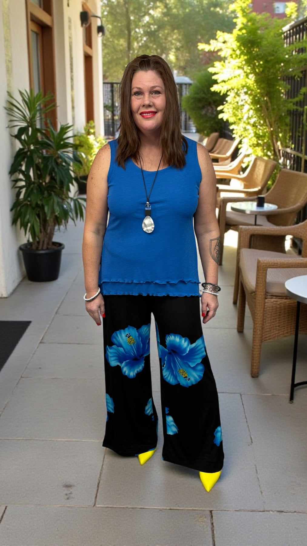 Designed for comfort, movement, and everyday elegance, these Canadian-made pants can be adjusted by tying them at the hem for a tapered look or leaving them loose as palazzo pants. Paired with a vibrant royal blue tank top, this duo transitions seamlessly from casual days to elevated moments. Wear the pieces together for a polished, coordinated outfit or style them separately to create multiple looks. Thoughtfully made in Canada, this set offers breathable comfort, flattering fit, and versatile style you’ll reach for again and again.