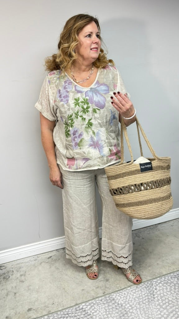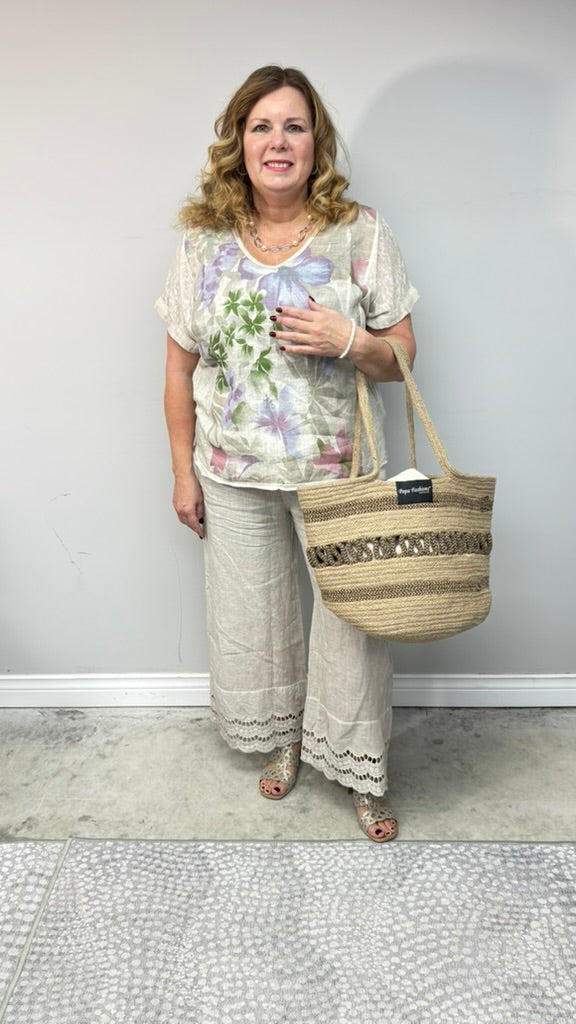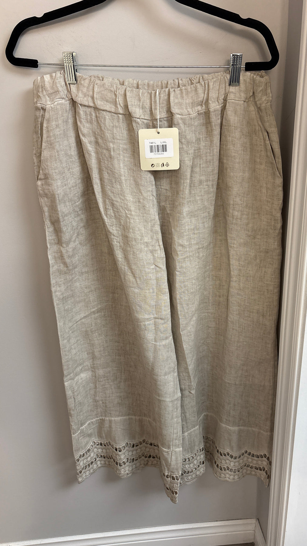 Thoughtful details elevate the design — practical side pockets for everyday wear and a subtle cut-out border at the hem that adds just the right touch of interest. The wide-leg shape moves gracefully with you, making these pants perfect for warm days, relaxed evenings, or polished casual outings.