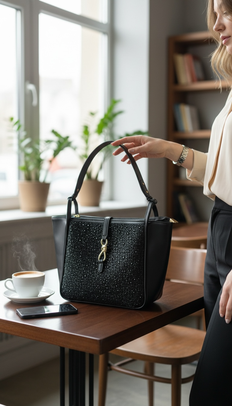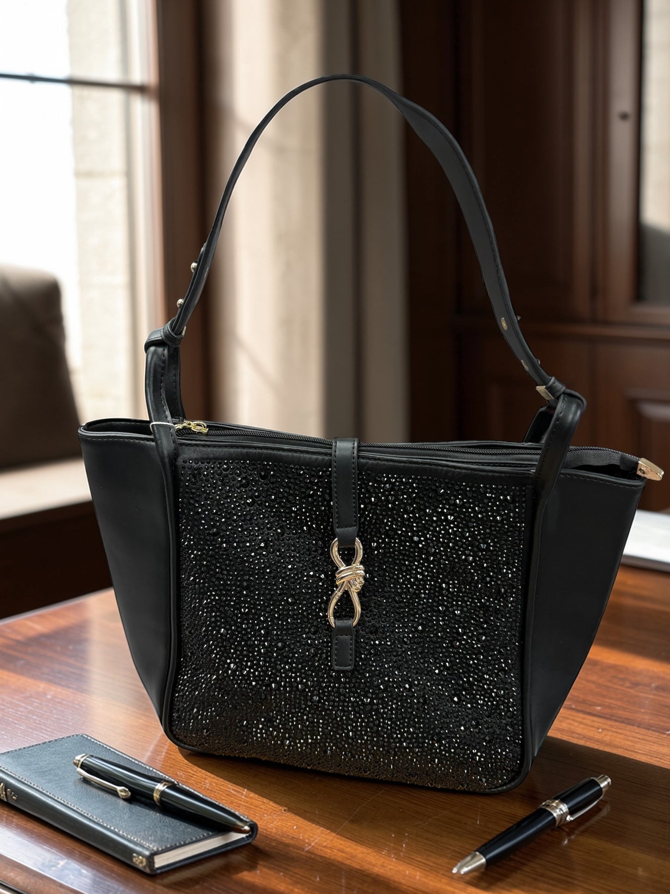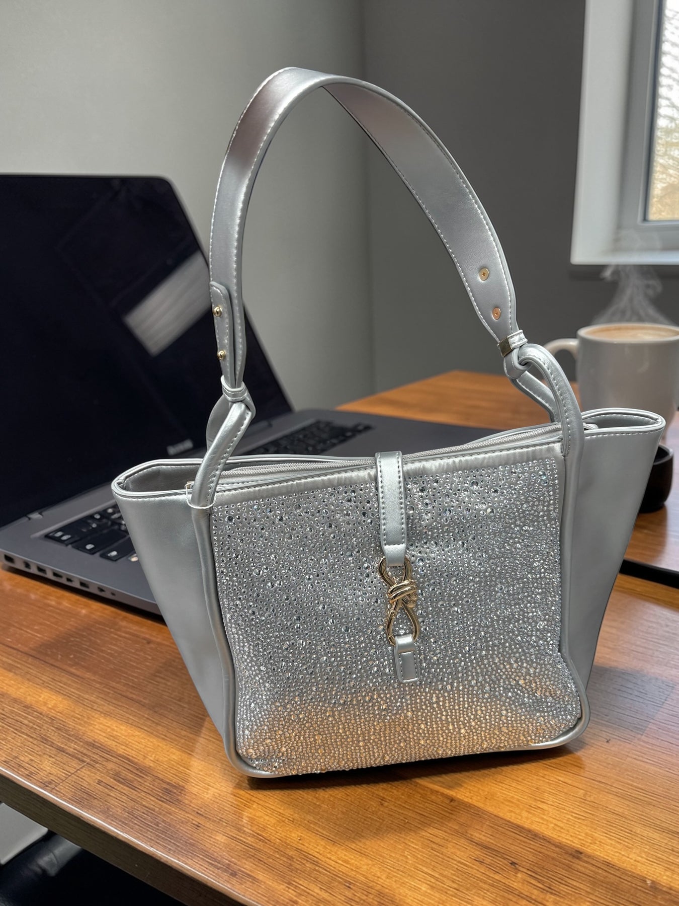 Not too big and not too small.... the size of this purse is just right. It has a zipper closure, as well as a flap over the top that is fastened by the decorative metal piece. One front side of the purse is blinged out. The back of the purse is smooth. We love the colour options of black or gold or silver. Perfect for the day when you need a few things, glasses, a water bottle, a snack, your phone, some makeup, tissues,.... you know... a purse that can hold all the essentials. Great for a work day, and transitions to a date night so easily without switching purses.
