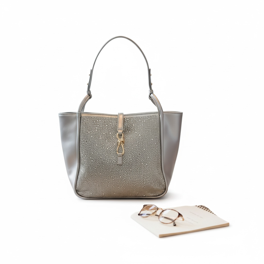 Add instant sparkle to your everyday style with the Silver Bling Tote Purse — the perfect blend of practicality and statement glam. Designed to take you seamlessly from the office to your next special occasion, this tote is thoughtfully sized to carry your essentials without feeling bulky.