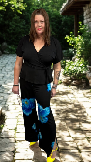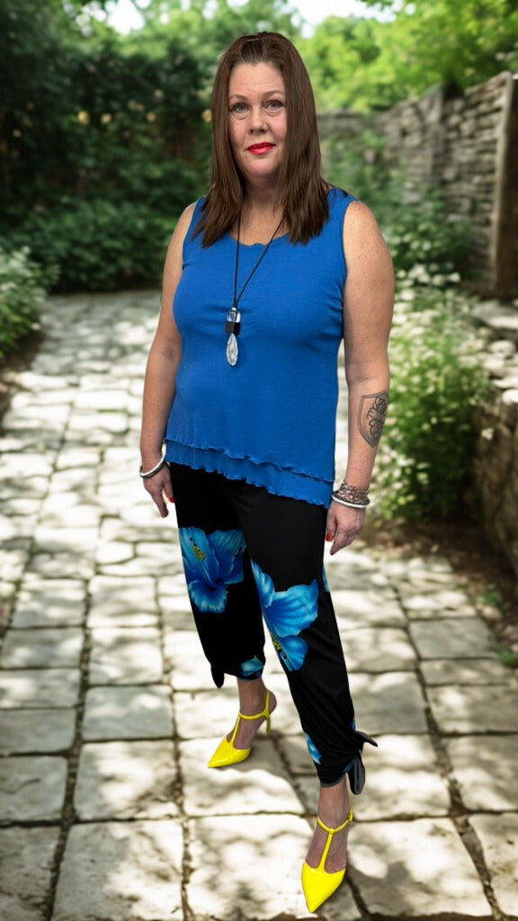 Designed for comfort, movement, and everyday elegance, this Canadian-made set features adjustable pants that can be tied at the ankle for a tapered look or worn loose as flowing palazzo pants. Paired with a vibrant royal blue tank top, this duo transitions seamlessly from casual days to elevated moments. Wear the pieces together for a polished, coordinated outfit or style them separately to create multiple looks. Thoughtfully made in Canada, this set offers breathable comfort, flattering fit, and versatile style you’ll reach for again and again.
