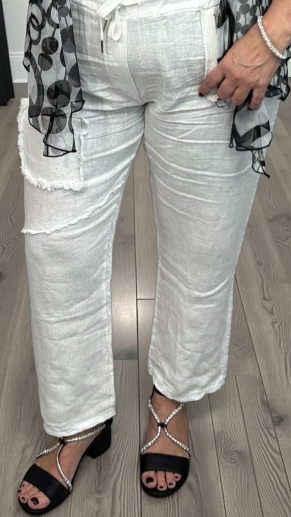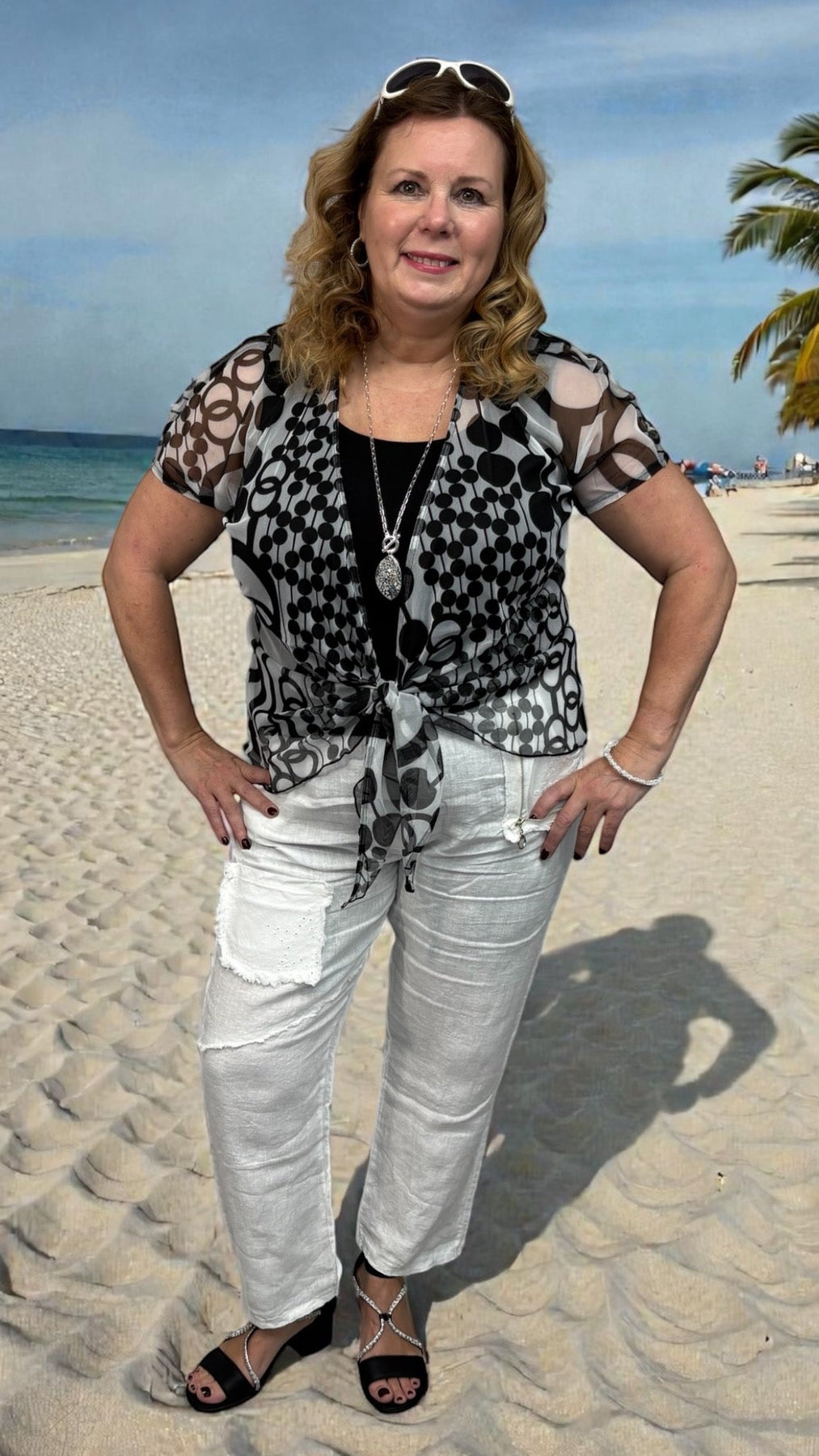These classic white linen pants are a wardrobe staple, perfect for creating relaxed, polished looks with ease. Designed for versatility, they can be worn tied at the ankle for a tailored fit or left untied for a flowing, relaxed silhouette. Paired here with a black-and-white sheer bolero, this outfit effortlessly transitions from casual daytime errands to evening gatherings. Breathable and lightweight, these pants are ideal for travel, warm weather, or any occasion where comfort meets style. From one of our favourite suppliers: Orange Fashion Village.
