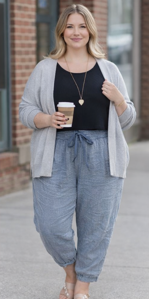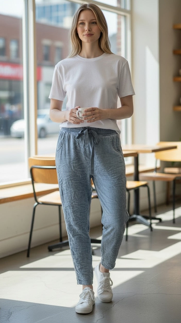 Stretchy and versatile, these blue pants feature a drawstring waist, front pockets, and the option to roll them up into capris. Perfect for travel or everyday comfort.