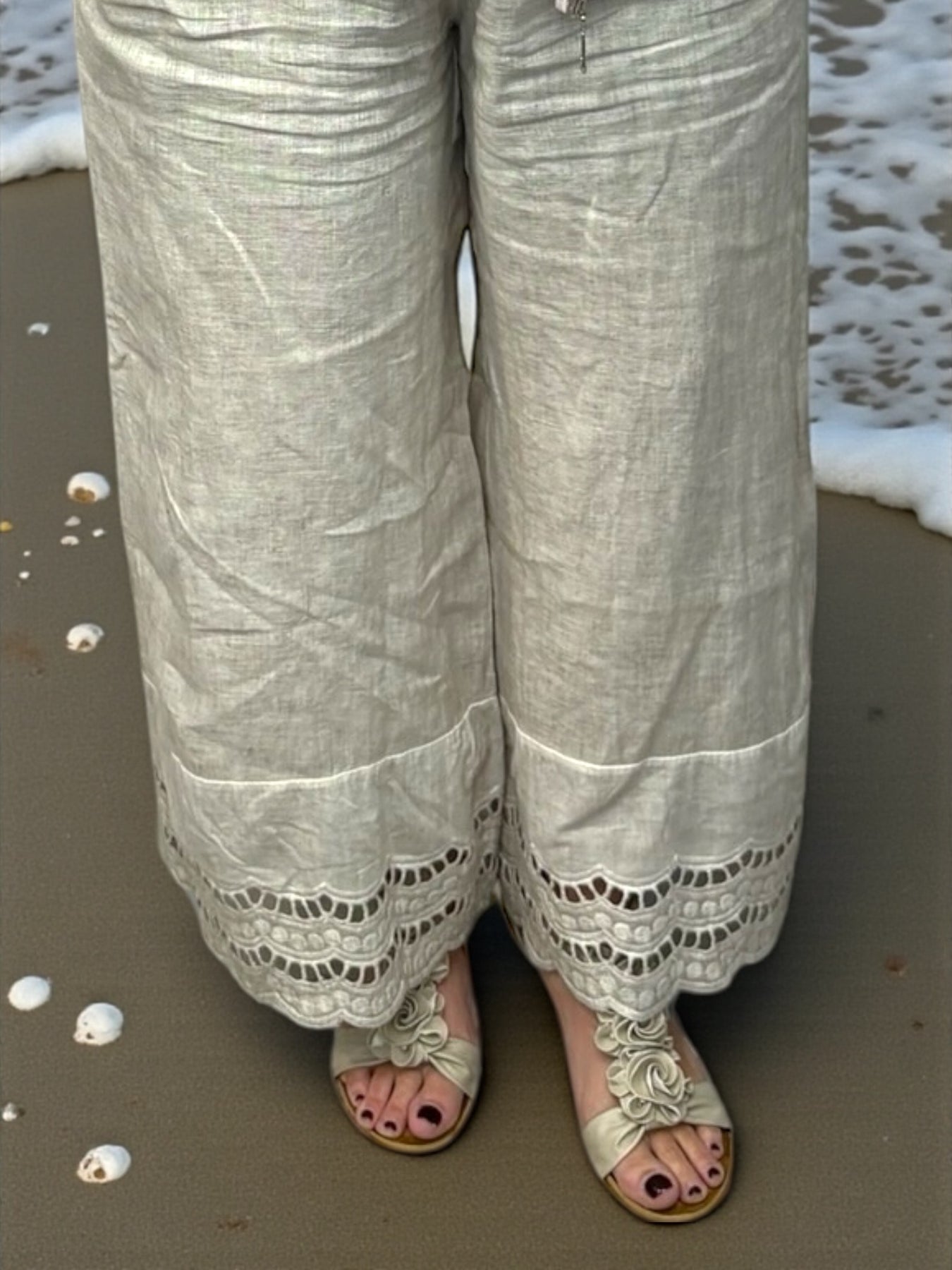 Linen Palazzo Pants for Women | Wide-Leg, Side Pockets, Cut-Out Hem