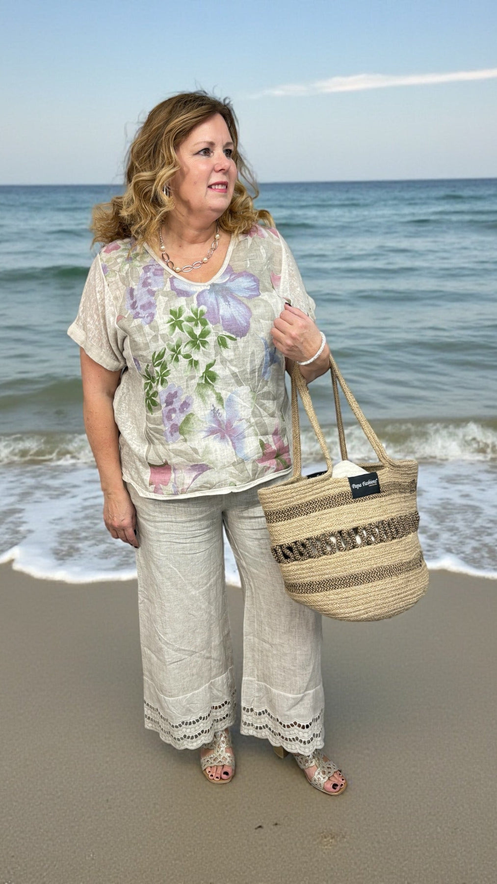 Thoughtful details elevate the design — practical side pockets for everyday wear and a subtle cut-out border at the hem that adds just the right touch of interest. The wide-leg shape moves gracefully with you, making these pants perfect for warm days, relaxed evenings, or polished casual outings.
