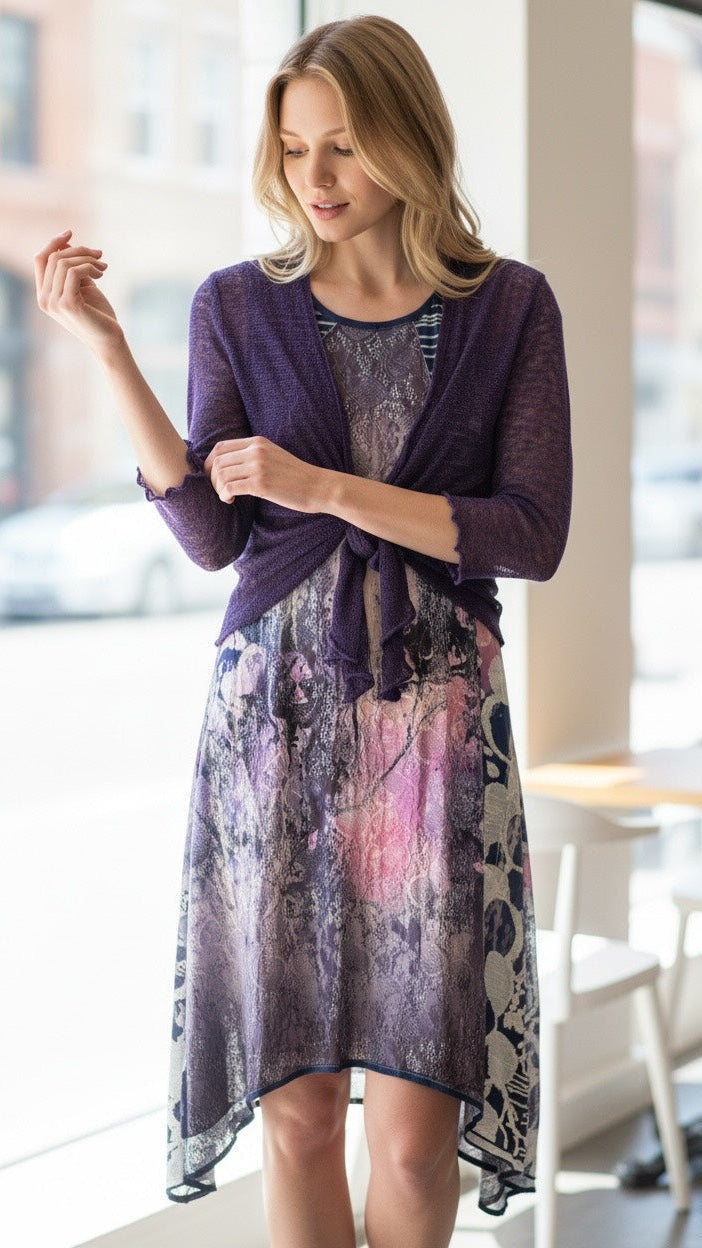 Create an effortlessly coordinated look by pairing the soft purple-toned tank dress with the matching plum bolero. Worn together, they offer just the right balance of comfort and polish — perfect for evenings out, special occasions, or anytime you want to feel quietly put-together.
